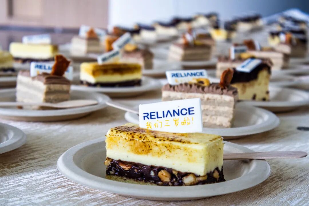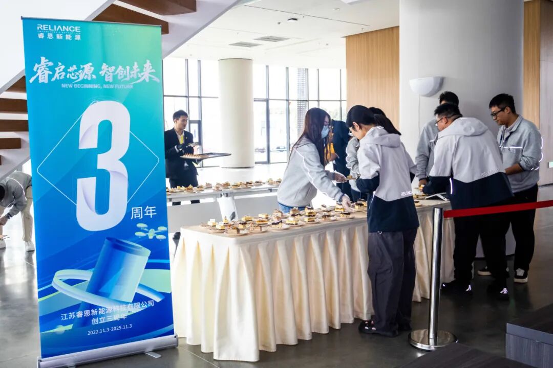 时光流转三载,江苏睿恩新能源迎来三周岁生日。这三年,是风雨奋进的三年,更是每一位睿恩人并肩筑梦的三年。今日,我们以“感恩同行,共庆三周年”为念,将专属甜蜜融入日常,用一块块点缀着专属设计的“reliance” logo 与 “我们三岁啦”字样的定制蛋糕,诉说对每位伙伴的谢意。