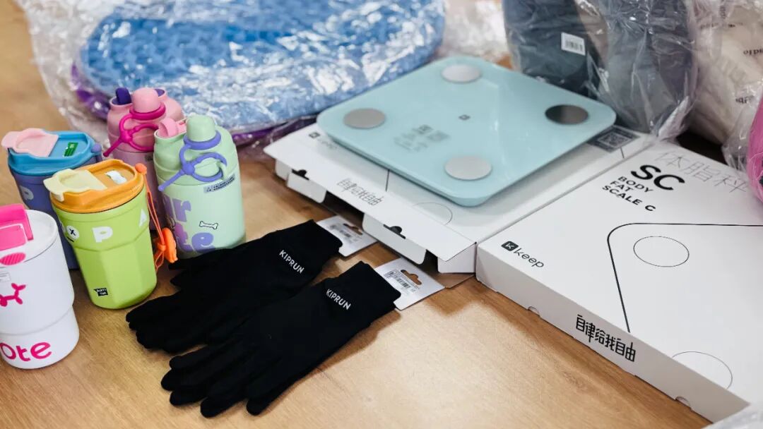 公司副总-蛟总为参赛选手颁发奖品。奖品由运动健身器材和冬季保暖好物组成。