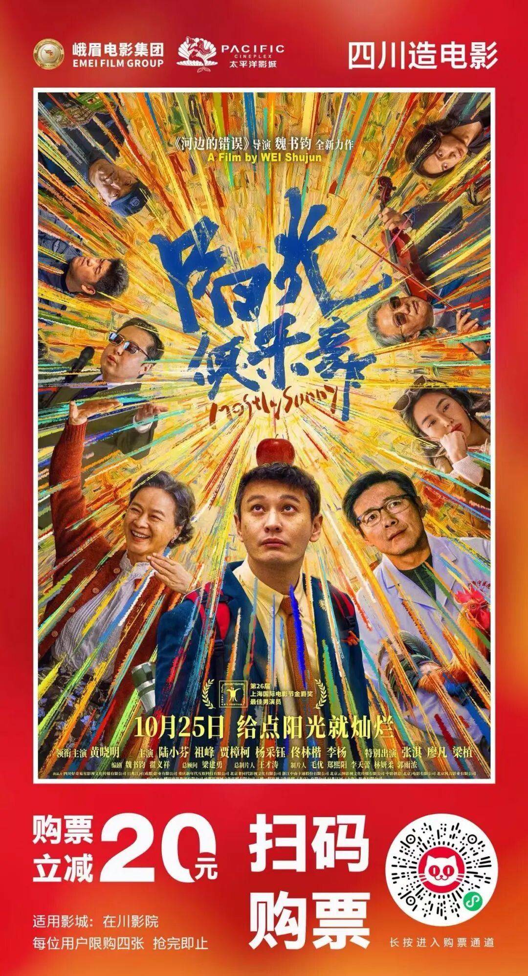 四川造电影《阳光俱乐部》诚意献礼!即日起,专属购票立减20元,用一杯奶茶的价格,收获双倍的感动与欢笑。扫码瞬间即刻开启暖心观影之旅——每人限购4张,数量有限,手慢无哦!