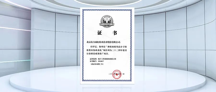 此次获评2024年建设行业科技成果推广项目,是东方雨虹种植顶板用高分子防排蓄水集成系统继2024年4月通过住房和城乡建设部科技与产业化发展中心评估委员会评定:达到国内领先水平,具有推广应用价值,获得《建设行业科技成果评估证书》后所取得的又一权威认可。