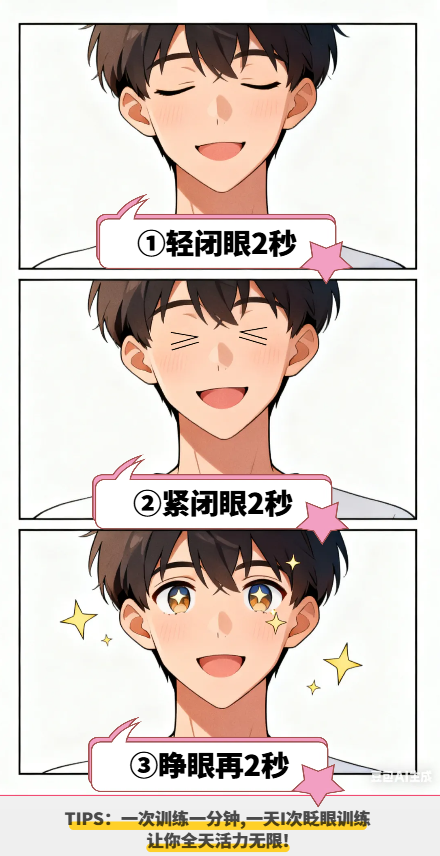 建议多做眨眼操:轻闭眼 2 秒→紧闭眼 2 秒→睁眼再 2 秒。每次训练 1 分钟,每天至少做 10 组眨眼训练!