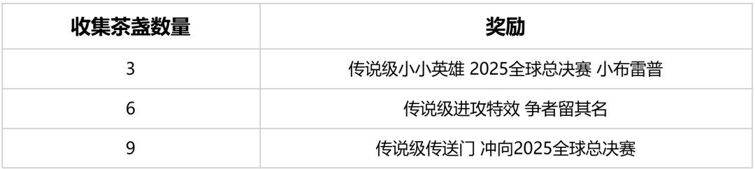 ● 里程碑奖励:收集茶盏,可免费领取2025全球总决赛主题奖励。收集数量及奖励如下: