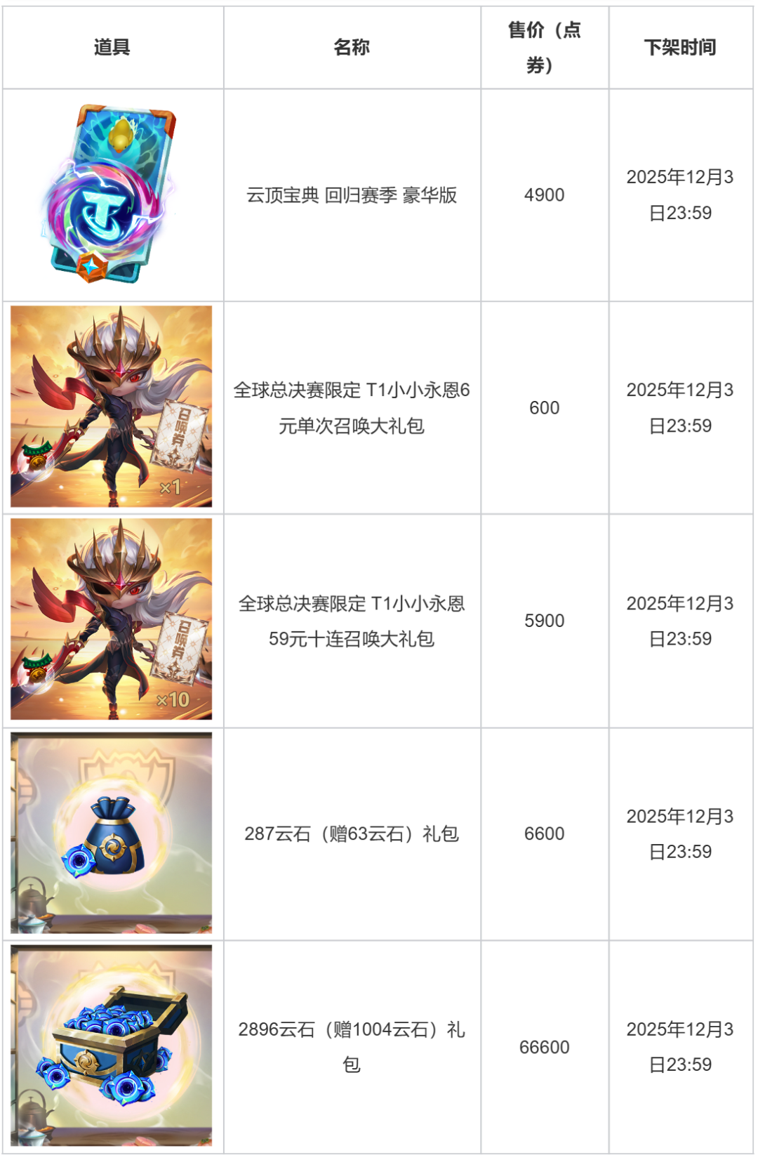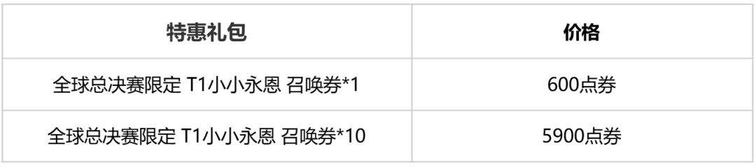 ● 特惠召唤:活动期间,玩家可付费解锁全球总决赛限定T1小小永恩召唤券礼包(每个礼包单Q单大区限购1次),内容及价格如下: