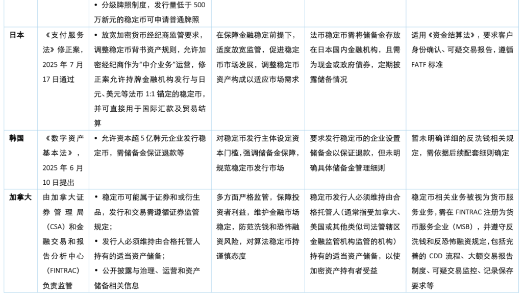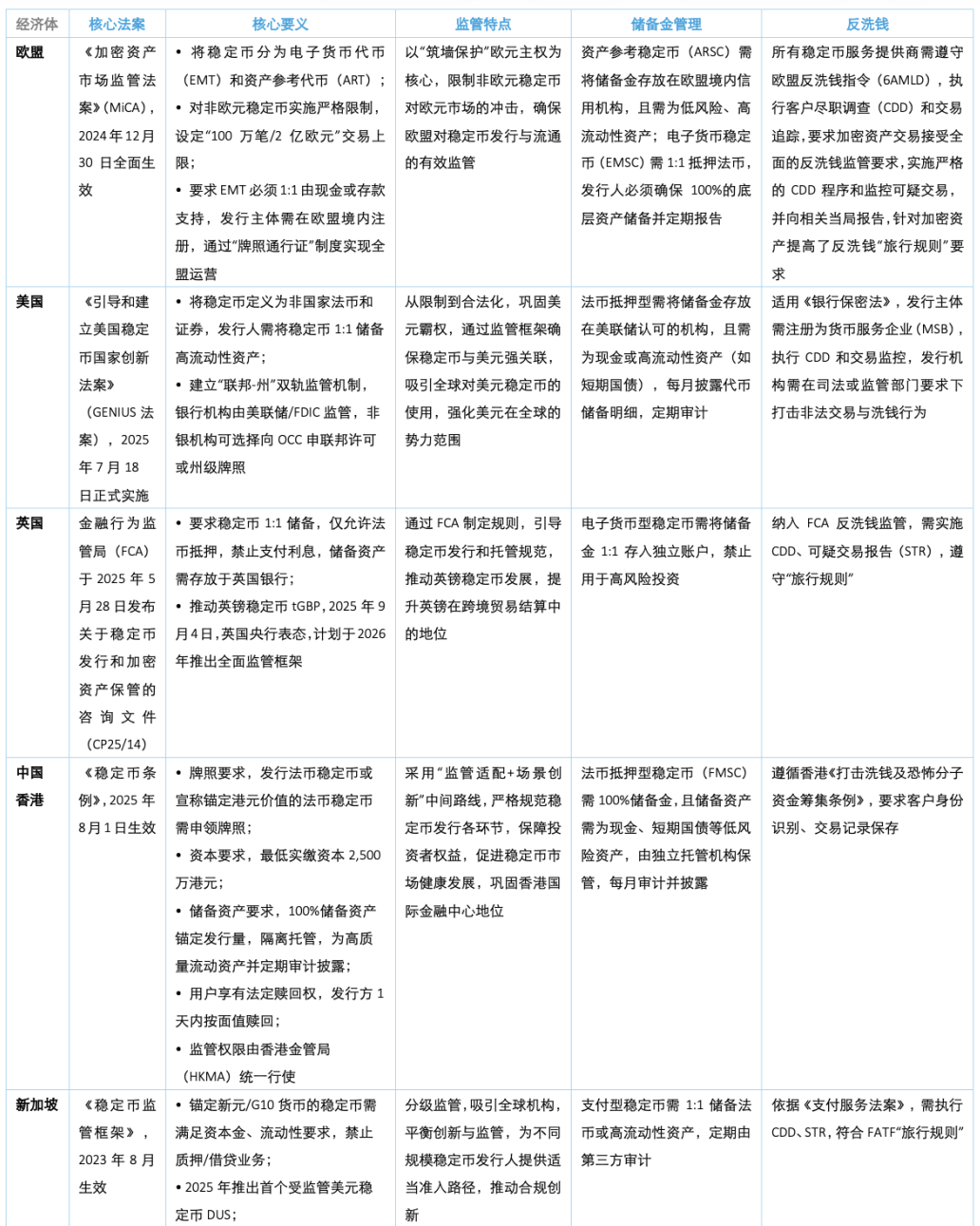 具体实践上,储备金透明化成标配—多数司法管辖区要求1:1或足额储备,强调独立托管与定期审计;反洗钱全面覆盖—稳定币服务普遍纳入反洗钱/反恐怖融资(AML/CFT)监管体系,严格执行客户尽职调查(CDD)等;牌照与准入机制逐步建立—从无序发展走向持牌经营,资本、技术、合规能力成为准入门槛。