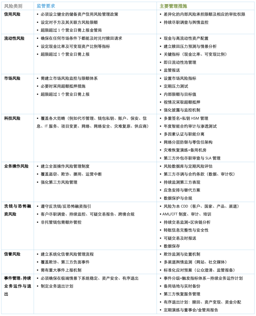 增设稳定币特有风险专项管理章节,明确风险识别、计量和管控流程,提升运营韧性。