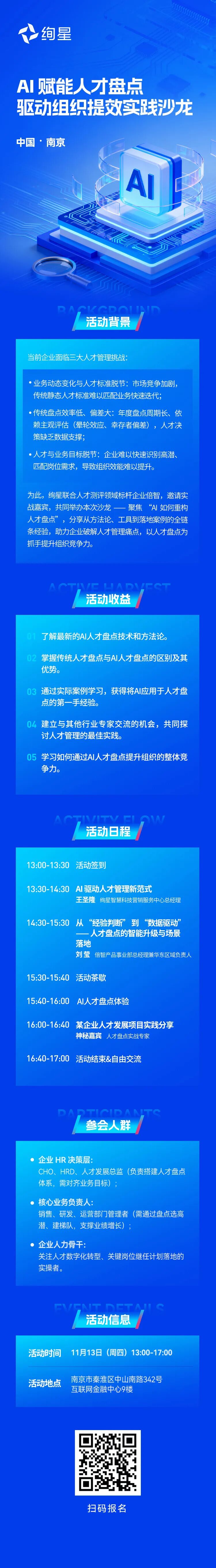 沙龙活动还将设置互动与定制化咨询环节,持续为企业提供智能生产力建设的前沿思路与可落地的实战支持。沙龙报名信息将在“绚星”订阅号发布,诚邀南京、苏州及周边地区的HR同仁把握机会,报名参加下一站沙龙,与行业专家面对面交流,共同开启AI时代的人才管理新篇章!