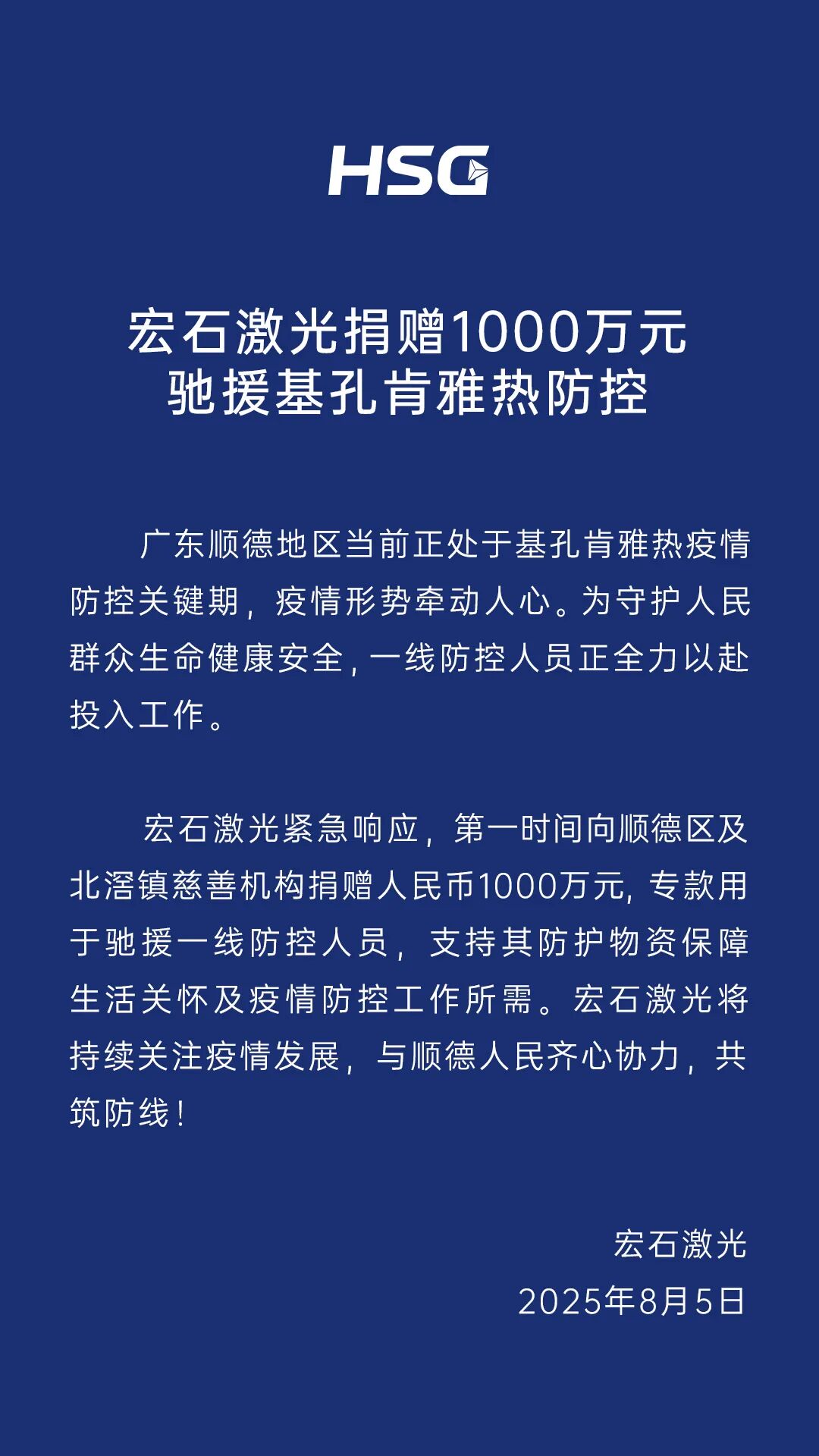 宏石激光捐赠1000万元驰援基孔肯雅热防控