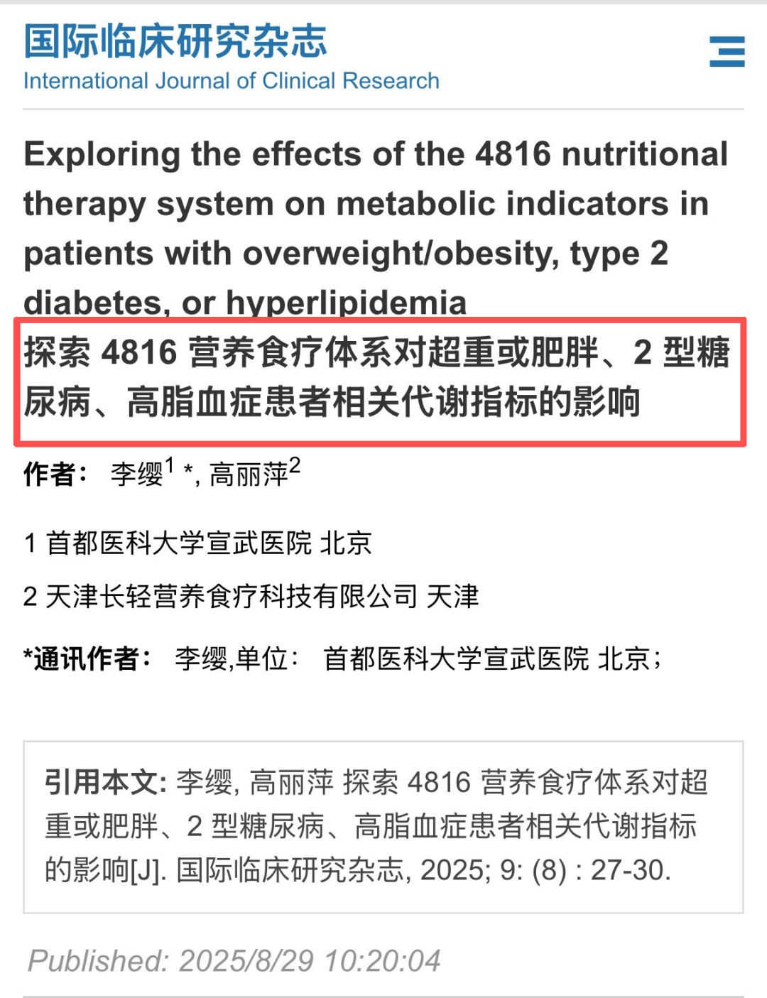 该论文由首都医科大学宣武医院的李缨和长轻集团营养师高丽萍共同完成。上述研究较早系统性地探讨营养食疗体系在慢性病管理中的综合作用,被业内视为对该领域系统性方法的重要探索。