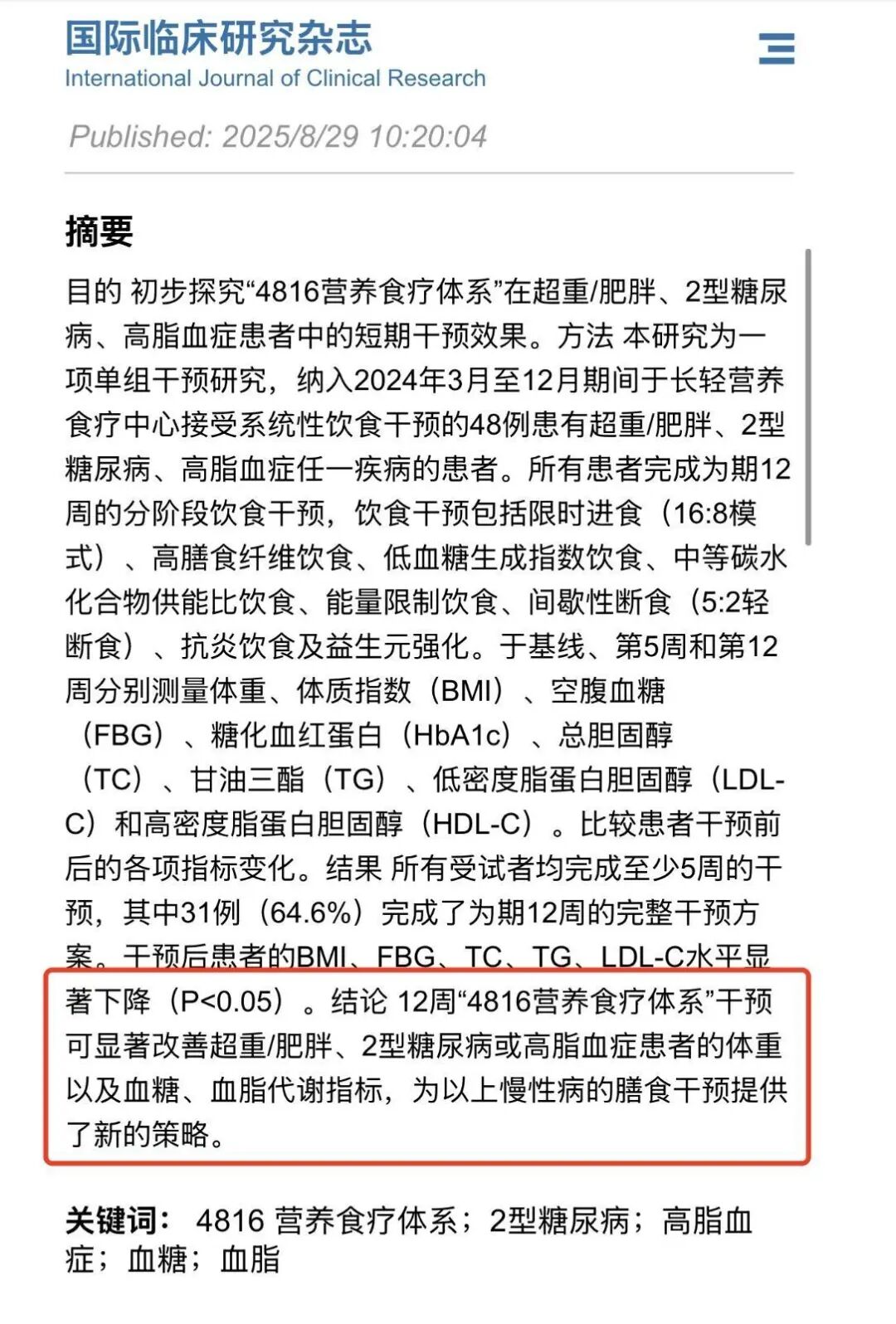 一项发表于《国际临床研究杂志》的论文证实,经12周“4816营养食疗体系”干预,超重/肥胖并伴有2型糖尿病或高脂血症的参与者的体重、血糖及血脂等关键代谢指标均得到改善。