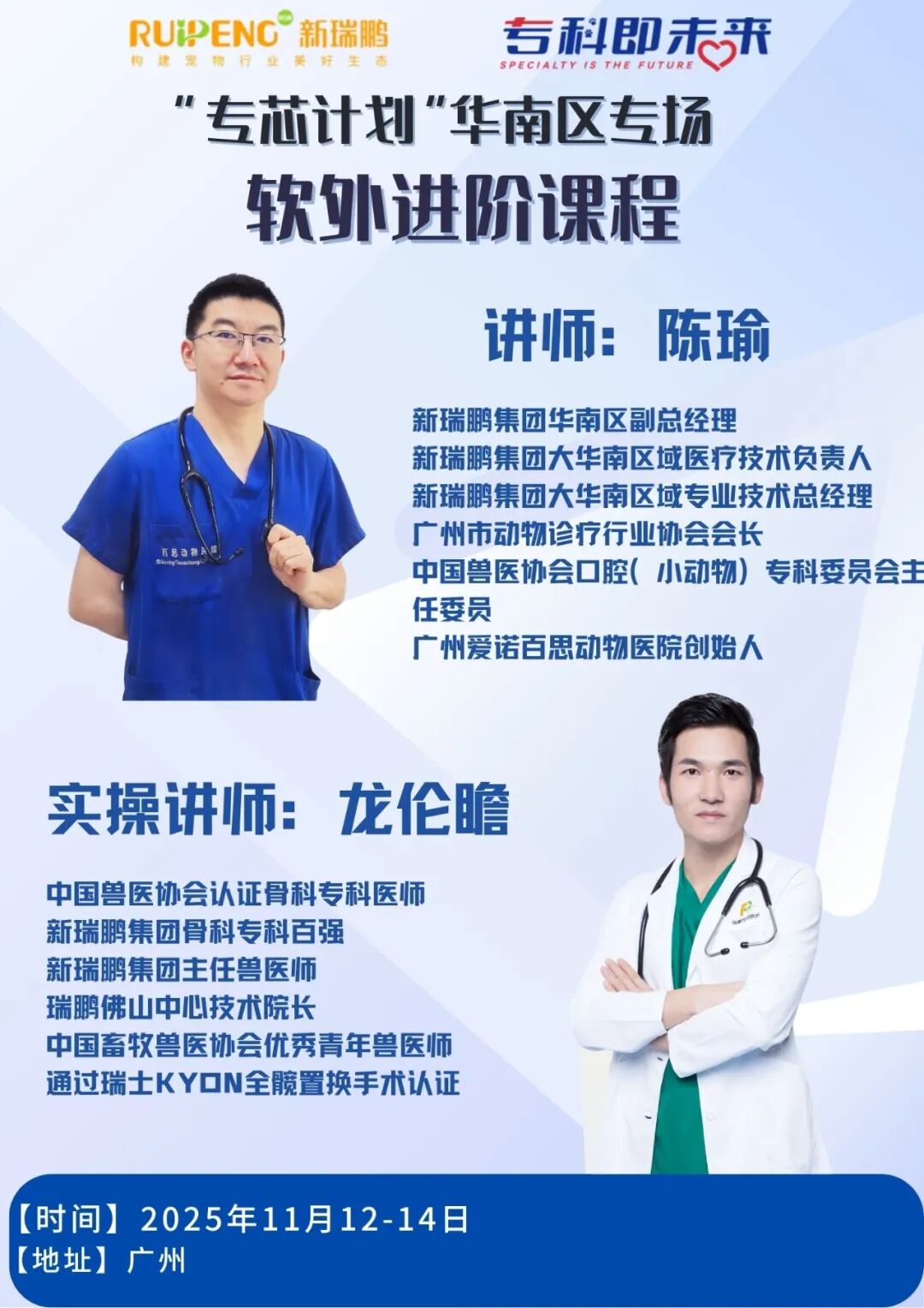 名师领航:本次课程我们有幸邀请到了新瑞鹏宠物医疗集团华南区副总经理兼专业技术总经理陈瑜老师和华南区佛山片区技术负责人兼瑞鹏佛山中心医院技术院长龙伦瞻老师,两位行业资深专家联袂授课,是高密度、高强度、高水平的三天。