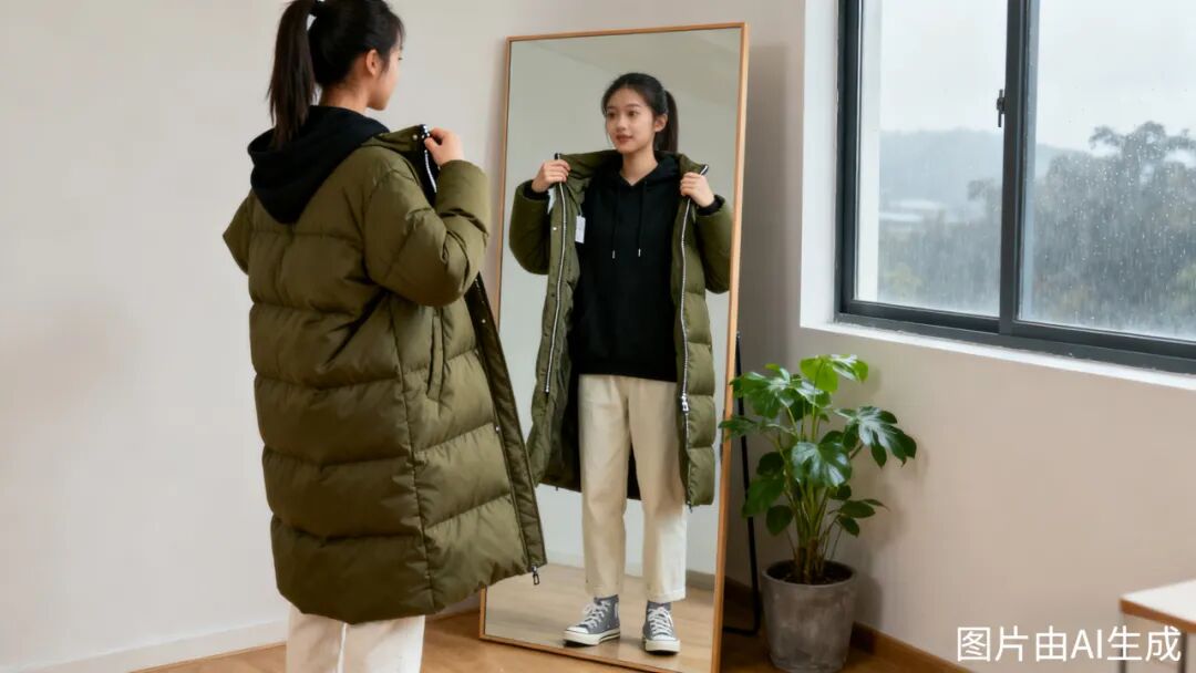 可选具有一定抗风能力的羽绒服、棉服或羊绒大衣。外层款式应稍微宽松,且最好选择下摆或袖口微收口的设计,防止冷风灌入。