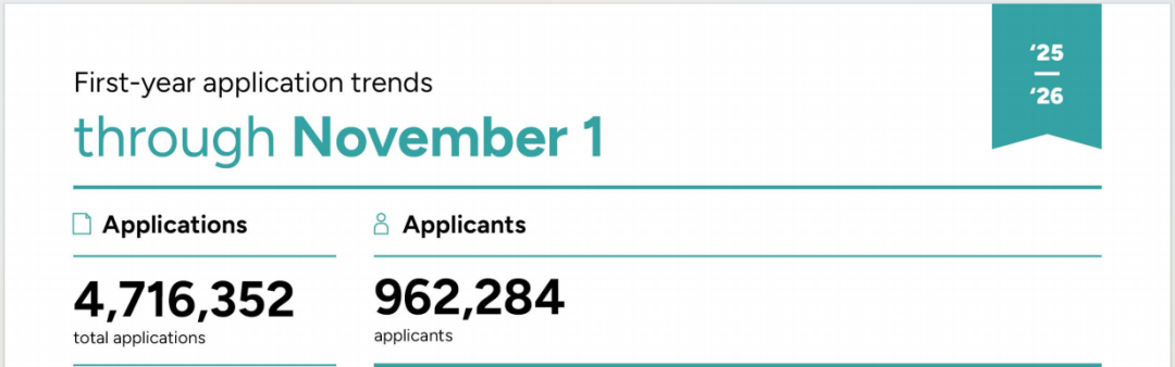 据统计,2025-2026申请季共有962,284名学生通过Common App递交申请,总提交量达到4,716,352份,较去年分别增长5%和10%,双双创下新高。