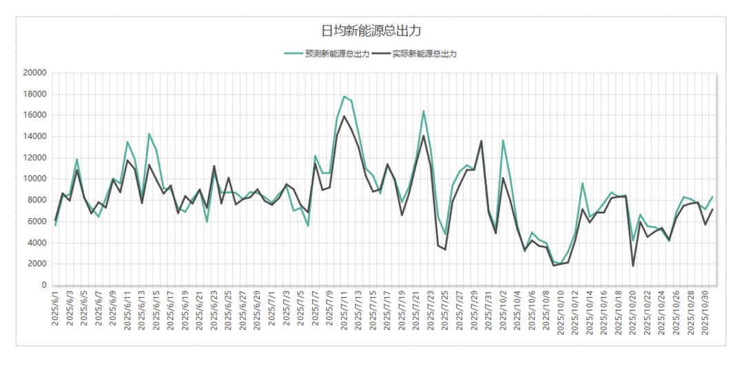 新能源出力预测平均8634兆瓦,最大预测32251兆瓦,发生在7月11日13:00。其中日均预测最高17744兆瓦,出现在7月11日,日均最低预测4819兆瓦,出现在7月25日。实际新能源出力平均8024兆瓦,最大出力28288兆瓦,发生在7月11日13:00。其中日均实际出力最高15885兆瓦,出现在7月11日,日均实际出力最低3348兆瓦,出现在7月25日。