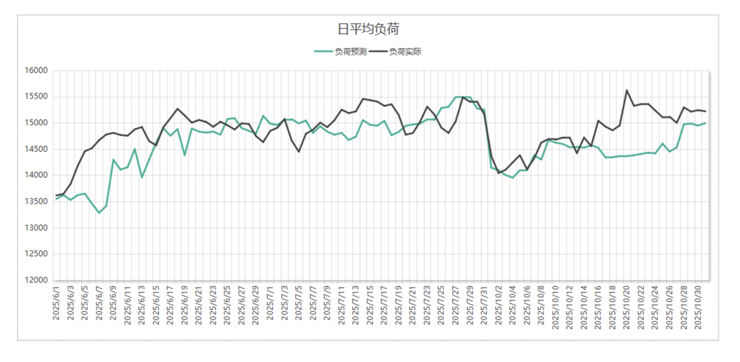 从日前市场看,6、7、10月份平均负荷预测为14619兆瓦,最大负荷预测16215兆瓦,发生在7月28日20:45,最小负荷预测12579兆瓦,发生在6月7日8:15,其中日均负荷预测最高出现在7月29日,最低负荷预测出现在6月7日。从实时市场看,平均负荷14878兆瓦,最大负荷16709兆瓦,发生在10月20日11:15,最小负荷12991兆瓦,发生在6月2日7:45,其中日均负荷最高出现在10月20日,最低负荷出现在6月1日。详情如下: