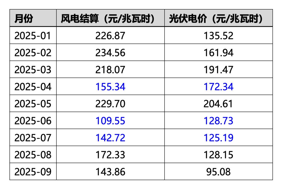 截至9月份,全省风电结算电量214.54亿千瓦时,结算均价182.3元/兆瓦时,光伏结算电量319.03亿千瓦时,结算均价148.4元/兆瓦时,分月结算电价表现如下。