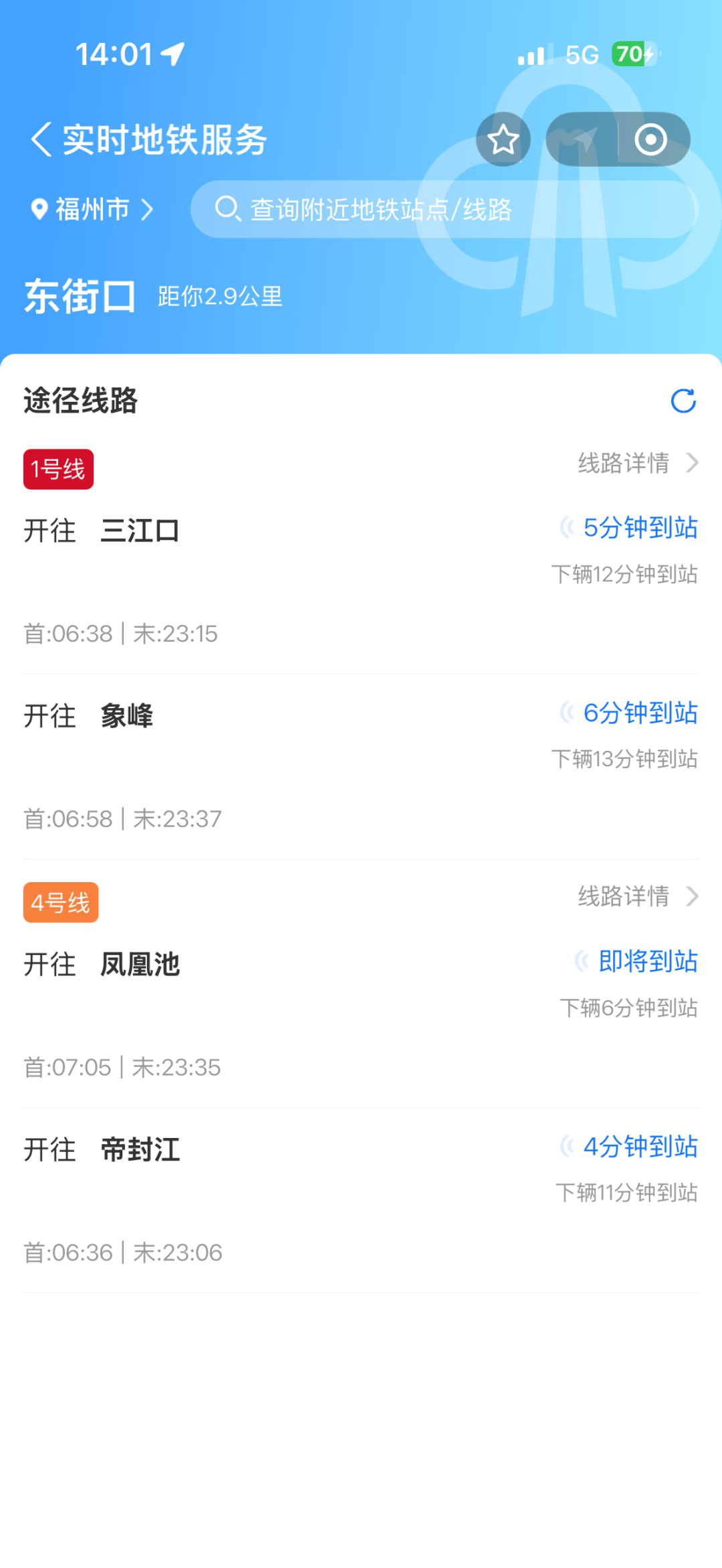 实时地铁查询:为用户提供精准的列车到站时间预报、线路运营状态、车厢拥挤度提示等信息,帮助用户高效规划行程,减少不必要的等待时间。
