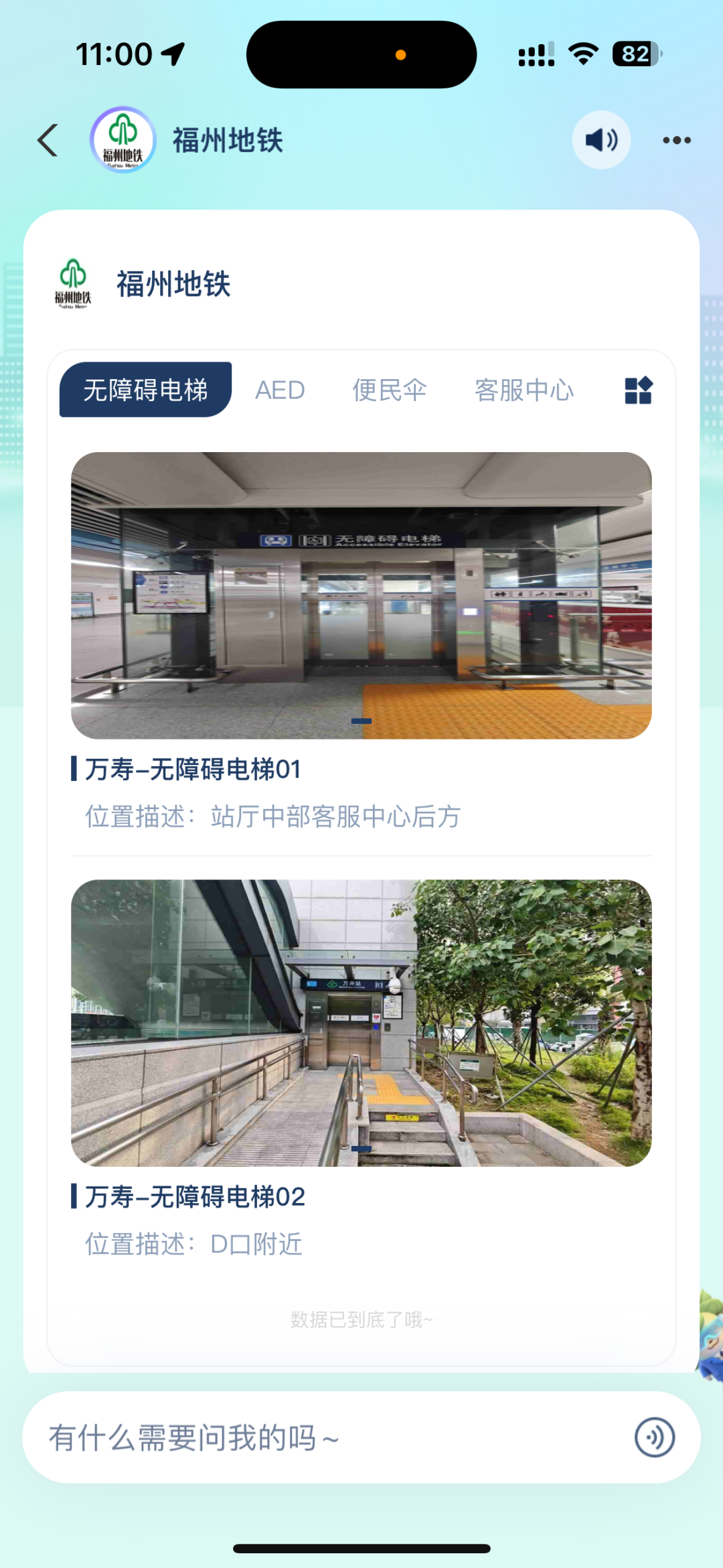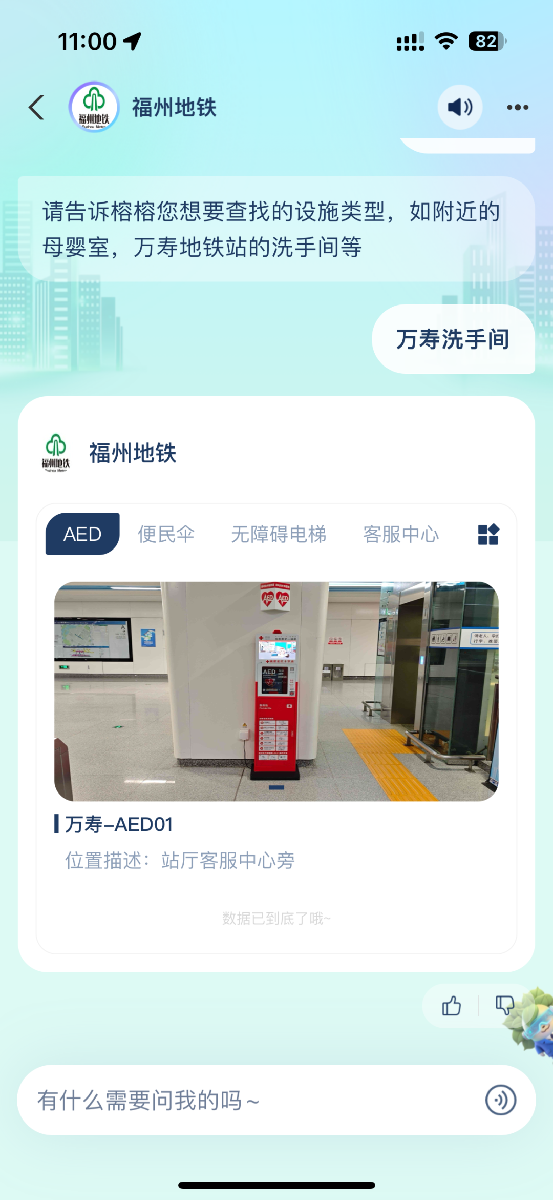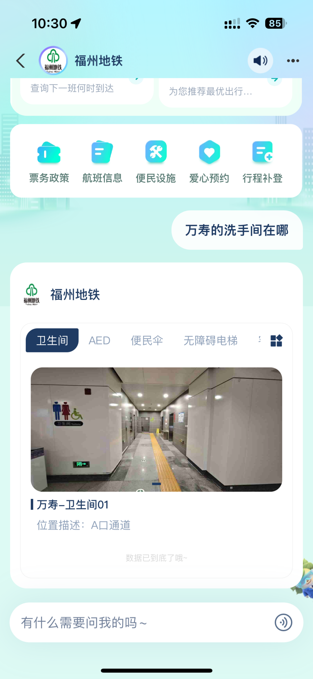 智能设施引导:通过一图定位精准标识车站内卫生间、电梯、AED设施、便民伞等便民设施,让用户彻底告别“站内迷路”。