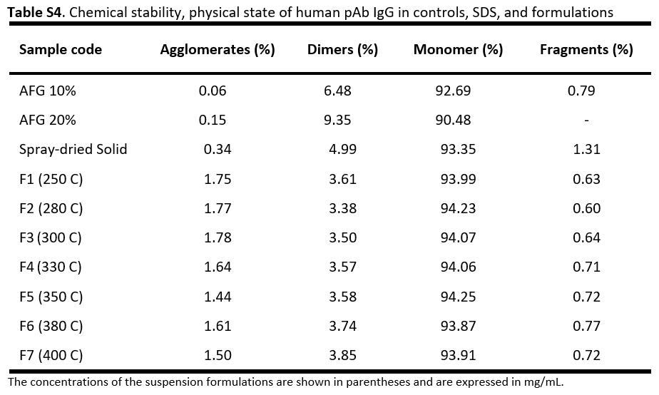 • 将hIgG溶液(50 mg/mL)喷雾干燥为固体粉末(SDS),优化参数(入口温度120°C,出口温度54°C),获得粒径90% <20 μm的微粒,单体含量93%,聚集体仅0.3%。