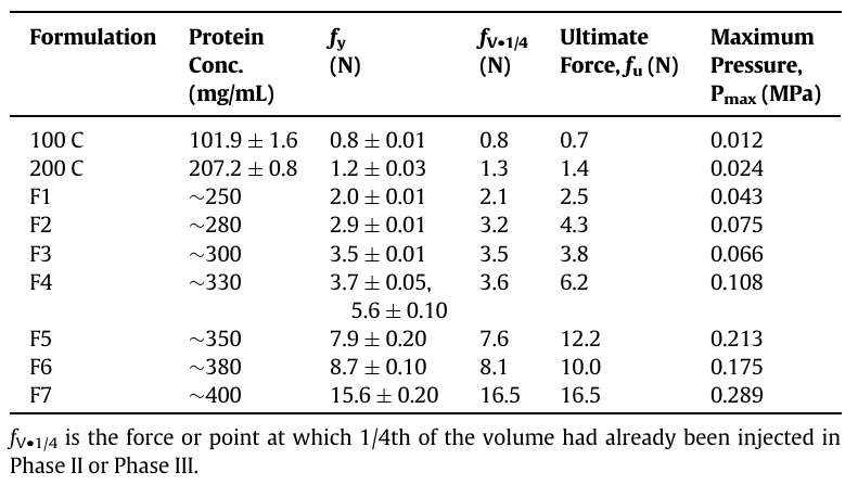 • 使用24G针头,注射力随浓度增加:300 mg/mL需3.8 N,400 mg/mL需16.5 N(远低于女性医师推荐上限40 N)。