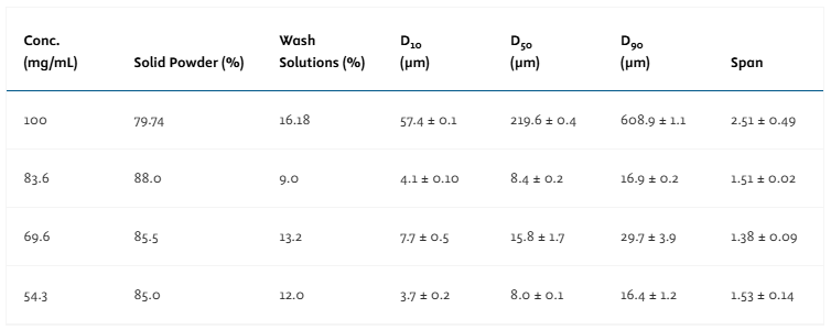 • 喷雾干燥粉末在120°C下稳定,悬浮液在长期储存中无明显聚集。