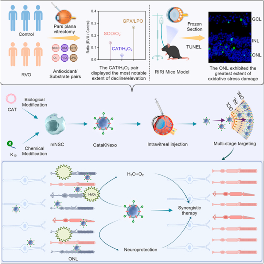 研究团队基于大量临床样本发现,视网膜缺血再灌注损伤样本中过氧化氢水平大幅升高且过氧化氢酶活性明显降低。针对这一发现,他们创新设计了聚赖氨酸修饰和过氧化氢酶表达的干细胞外泌体,使工程化外泌体带有正电荷,借助眼球的电场极性实现靶向眼底的效果。
