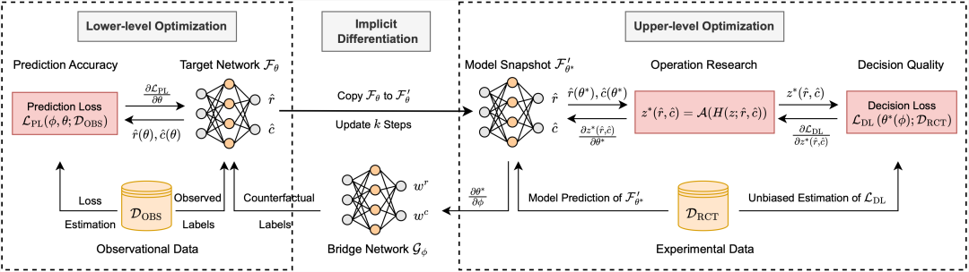 为此,我们提出了基于决策的双层优化因果学习框架,系统性地应对上述挑战。首先,我们基于RCT数据构建决策质量的无偏估计量,通过连接离散优化梯度的代理损失函数指导模型训练。其次,我们建立了一个融合观测数据与随机实验数据的双层优化框架,并采用隐函数微分方法进行求解。这一优化框架使得无偏的决策质量估计量能够有效校正有偏观测数据的学习方向,从而实现偏差与方差的最优平衡。我们在公开基准数据集、工业营销数据以及大规模在线A/B测试中进行了全面评估,结果表明该方法相较于现有技术取得了统计显著性提升。