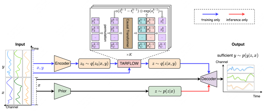 针对上述问题,本文提出融合Transformer自回归流(TARFLOW)与变分自编码器(VAE)的新型生成框架TARFVAE。基于"复杂时序表征网络可能非必要"的反思,我们创新性地在VAE框架中引入TARFLOW模块,通过打破传统高斯假设约束,促使潜在变量自主学习预测相关特征,构建信息更丰富的隐空间。该框架仅采用TARFLOW前向过程,规避了自回归逆运算,结合VAE解码器实现单步全周期预测生成。实验表明,仅使用多层感知机构建的TARFVAE在多个基准数据集上展现出显著优势:相比当前最优的确定性方法和生成模型,其在不同预测周期(包含长周期预测)中取得更优的预测精度,同时保持高效推理速度(单次前向计算完成预测)。这为时间序列预测任务提供了兼具高效性和准确性的新型生成式解决方案,验证了简化模型架构在保持性能优势方面的可行性。