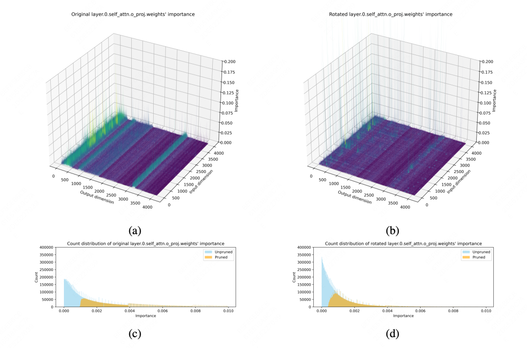 针对这一根本性矛盾,我们提出了“重要性聚集”机制:不再局限于被动筛选权重,而是通过主动重塑重要性分布来提升剪枝鲁棒性。具体而言,我们开发了DenoiseRotator框架——该框架利用Transformer架构的计算不变性,通过可学习的正交变换动态调整权重重要性分布。如图所示,这些正交变换经过训练可将参数重要性集中到较小的子集中,从而在剪枝前使模型“更容易被剪枝”。DenoiseRotator在多个模型和任务上实现了显著的剪枝性能提升,为模型压缩领域提供了兼具理论深度与实践价值的新范式。