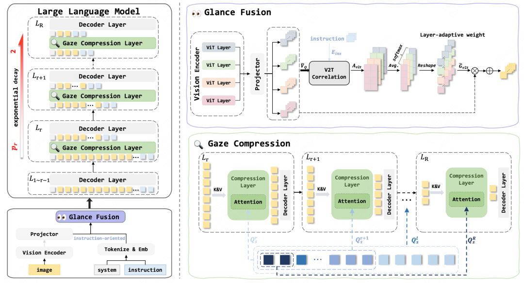 论文简介:现有视觉多模态大模型中,视觉Token的增长虽能够提升模型的理解能力,却显著增加了计算量。近期的视觉Token剪枝方法多采用丢弃视觉Token,未能模拟人类处理视觉问答的全局扫视和局部凝视的过程。我们提出语义引导的视觉特征增强策略来提升视觉表征能力,同时利用共享QueryPool的渐进式压缩策略逐步压缩视觉Token。该方法在节省70%计算量时,仅损失0.1%的性能,显著超越现有SOTA压缩方法。