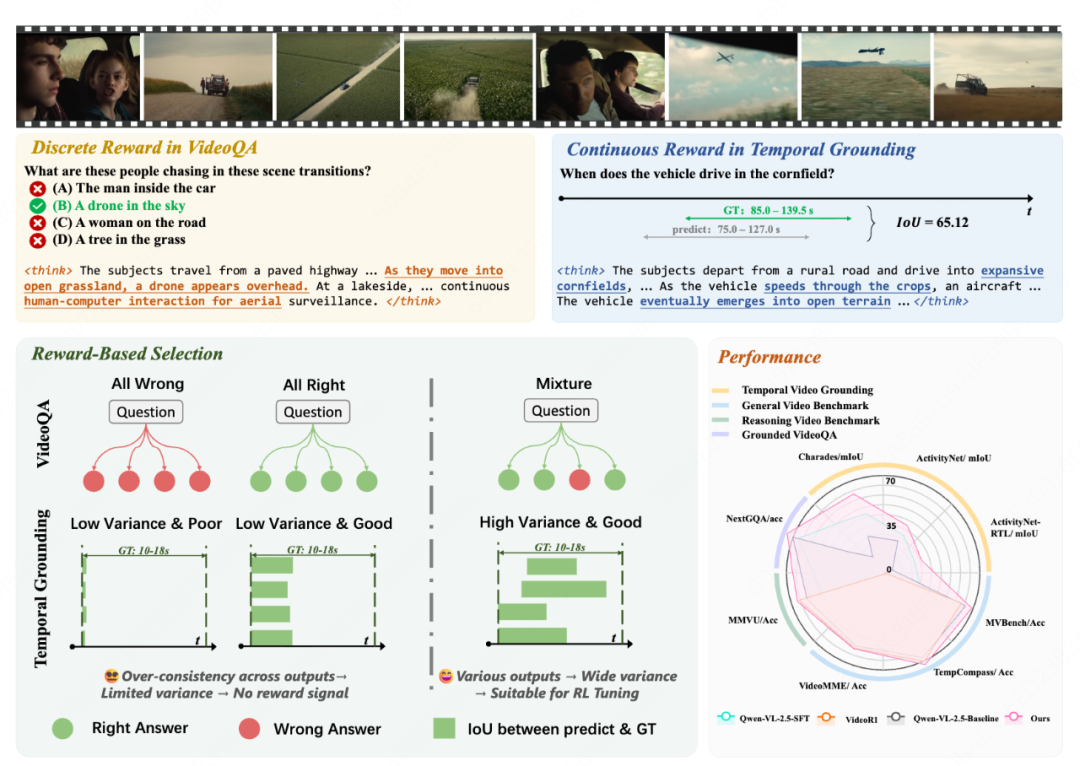 论文简介:理解复杂语义和长时序依赖的真实世界视频是计算机视觉的难题。我们提出TemporalRLT方法,作为多模态大语言模型(MLLMs)的视频推理后训练策略(GRPO)和双重奖励机制,分别监督语义与时序推理。通过难度感知的数据选择,优化学习信号。实验在八项视频理解任务(如VideoQA、时序视频定位等)中表明,TemporalRLT在显著减少训练数据的情况下,性能优于有监督微调和现有RLT方法,凸显了奖励设计与数据选择在视频推理中的重要性。