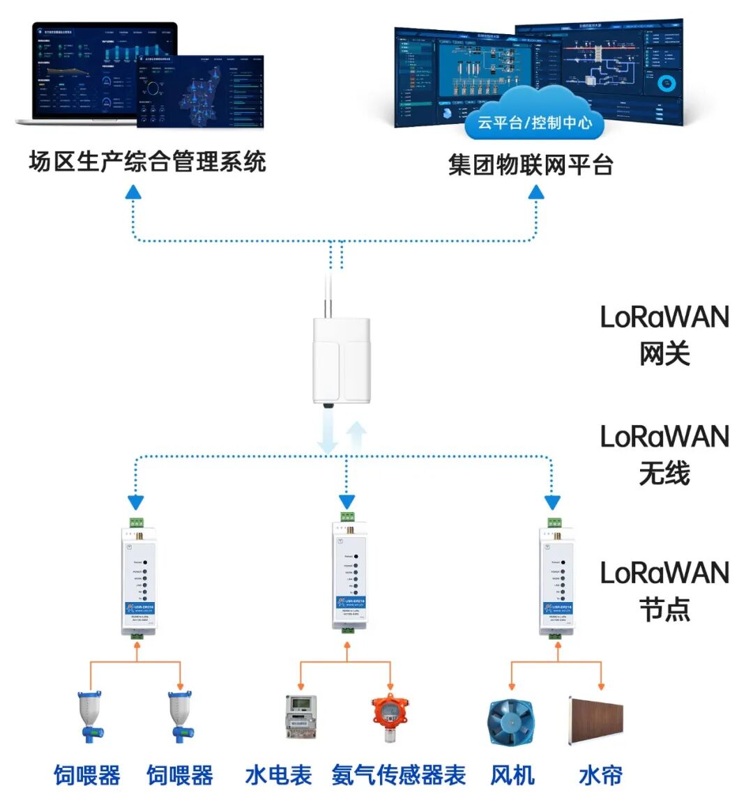 场景案例:偏远养殖场的智慧畜牧全厂覆盖。 在位置偏远、缺乏蜂窝网络覆盖的大型养殖场,需要对牲畜饲喂、圈舍环境、设备安全等进行全面监控。特点是区域广袤、设备分散、需电池长期供电,且需接入多种类型的传感器。 方案特点:部署LoRaWAN网络,实现养殖场全区域的无线信号覆盖。支持接入基于标准协议的各种LoRaWAN传感器,如智能饲喂器、环境监测终端(温湿度、氨气)、断电报警器、生物安全(门禁、入侵)传感器等。所有数据通过少量网关统一上传至管理平台,实现对养殖过程的全面数字化管理。 核心价值:低功耗、广覆盖、大容量,适合海量低速率节点的规模化部署。 推荐产品:LG280(网关),DR206-CN470(节点)