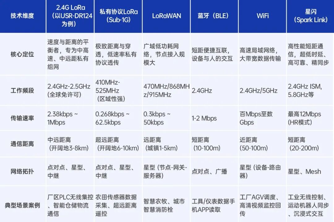 WiFi/蓝牙胜在高速与便捷,但覆盖距离有限,且WiFi功耗高、蓝牙组网能力弱。 私有协议LoRa/LoRaWAN在传输距离和功耗控制上表现卓越,但速率较低,不适合需要频繁交互或大数据量的场景。 星闪技术在超低延迟、高同步精度和可靠性上表现突出,是工业级高精度控制等场景的新锐选择。 2.4G LoRa,正如DR124所展现的,正是在“速度”与“距离”之间找到了一个出色的平衡点。