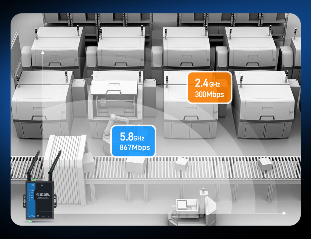 场景案例:车间固定设备的快速网络化集成。 车间里有多台串口打印机、老旧PLC或检测设备,需要通过以太网接入工厂MES系统,但重新布线成本高昂。 方案特点:在设备端旁部署WiFi串口服务器,将设备的RS232/RS485串口立即转换为无线网络接口。设备可快速接入现有企业WiFi网络,实现与服务器的高速数据交换,传输速率远超其他无线方案。 核心价值:利用现有WiFi基础设施,为串口设备提供高速、即时的网络接入能力。 推荐产品:W630s、W610(高通版)、W660