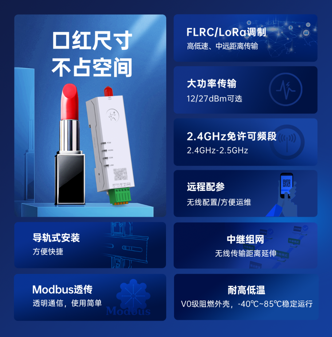 双调制模式,场景自适应:可在远距抗干扰的LoRa和高速稳定的FLRC模式间切换,一机多用。 强大的中继组网:支持多级跳传,轻松扩展网络边界,化解环境遮挡难题。 工业级的可靠设计:-40°C ~ 85°C宽温工作、独立硬件看门狗、V0级阻燃,适应严苛环境。 运维极简化:支持远程无线配参,无需跑现场;配备信号检测指示灯,部署调试一目了然。 安装便捷:紧凑的“口红式”外观与导轨安装,轻松集成入柜。 ▼点击图片 了解更多产品详情▼