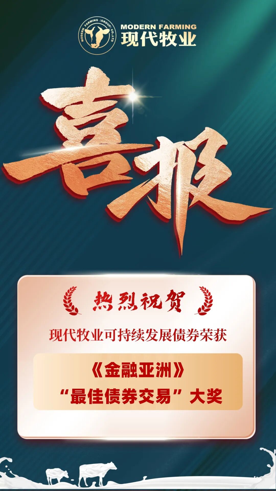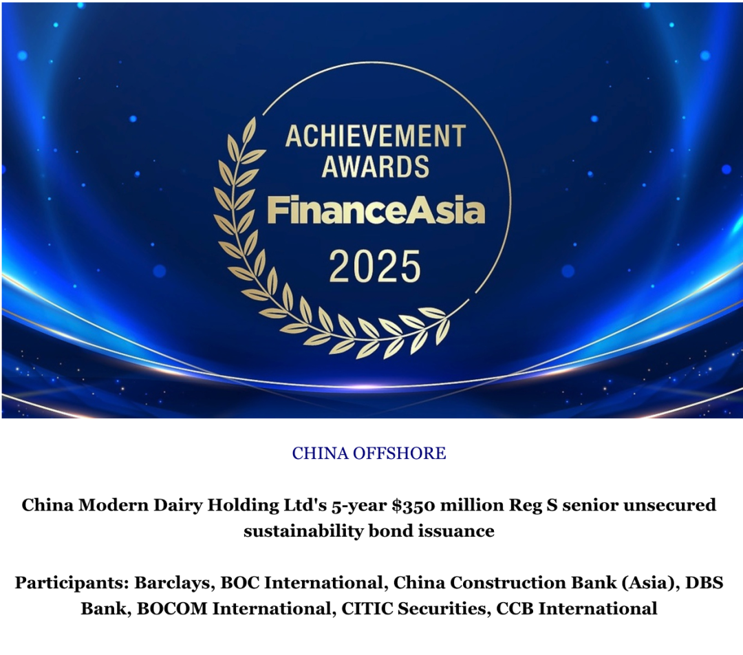 2025年11月28日,中国领先的奶牛养殖企业中国现代牧业控股有限公司(“现代牧业”)宣布,其5年期3.5亿美元高级无抵押可持续发展债券发行项目,荣获权威财经杂志《金融亚洲》(FinanceAsia)颁发的“2025年度最佳债券交易”(中国离岸市场)大奖。此项殊荣是对现代牧业在可持续金融领域的创新领导力、卓越的交易执行能力以及对行业产生深远积极影响的高度认可。