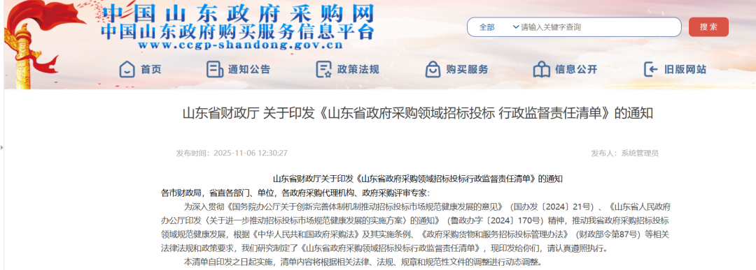 山东省财政厅关于印发《山东省政府采购领域招标投标行政监督责任清单》的通知