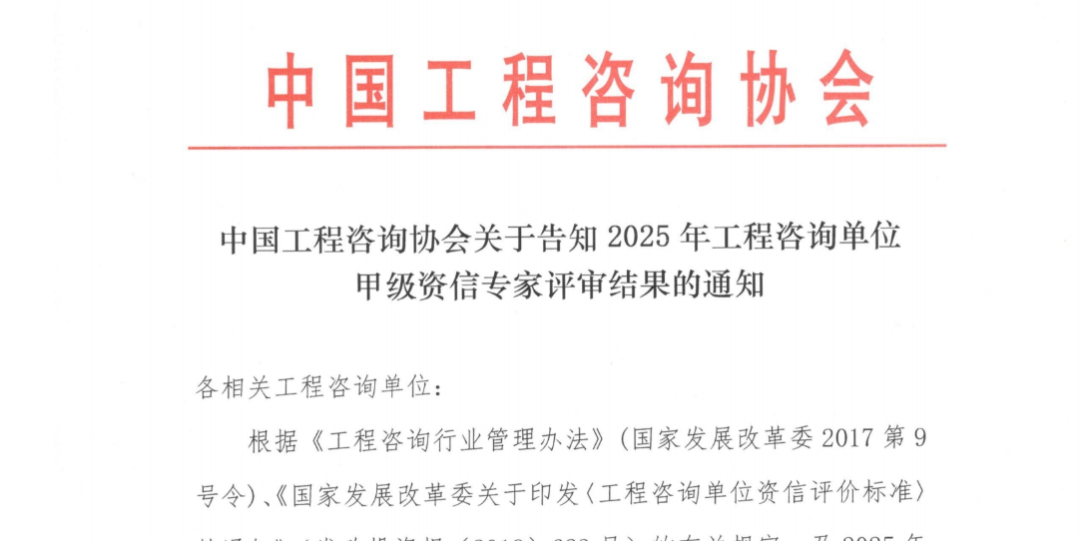 中国工程咨询协会《关于告知2025年工程咨询单位甲级资信专家评审结果的通知》