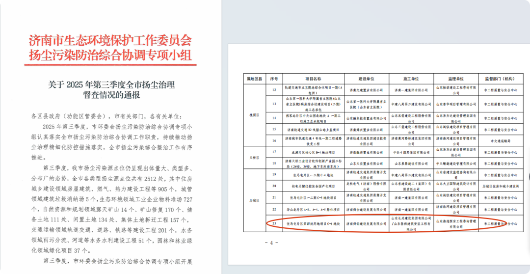 山东海逸恒安工程咨询管理有限公司张马屯片区第四批用地C-6地块监理项目部因施工现场扬尘治理工作情况较好、各项措施落实及时到位,获全市通报表扬。