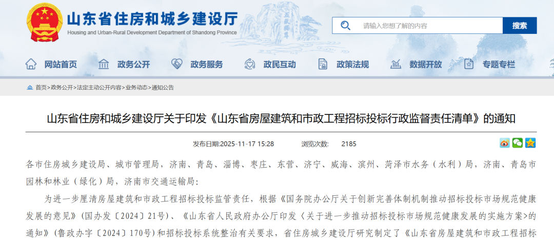 山东省住房和城乡建设厅关于印发《山东省房屋建筑和市政工程招标投标行政监督责任清单》的通知