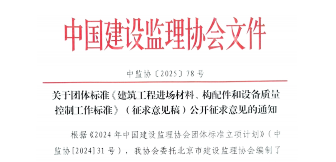 中国建设监理协会关于团体标准《建筑工程进场材料、构配件和设备质量控制工作》(征求意见稿)公开征求意见的通知