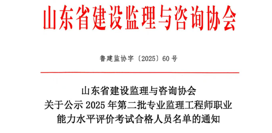 山东省建设监理与咨询协会《关于公示2025年第二批专业监理工程师职业能力水平评价考试合格人员名单的通知》
