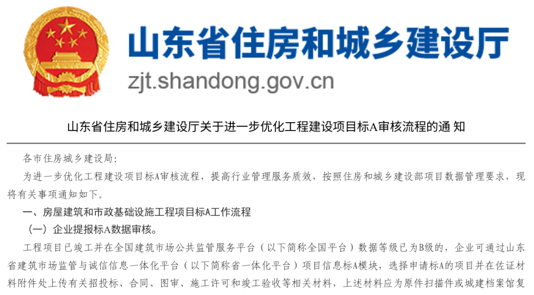⼭东省住房和城乡建设厅《关于进⼀步优化⼯程建设项⽬标A审核流程的通知》