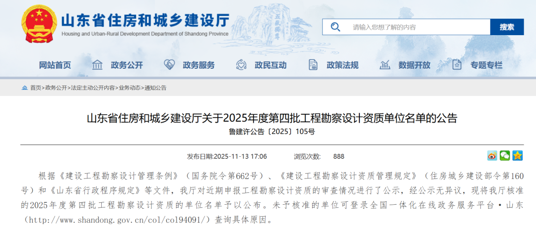 山东省住房和城乡建设厅《关于2025年度第四批工程勘察设计资质单位名单的公告》