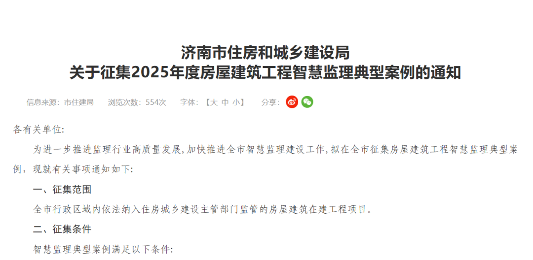 济南市住房和城乡建设局《关于征集2025年度房屋建筑工程智慧监理典型案例的通知》