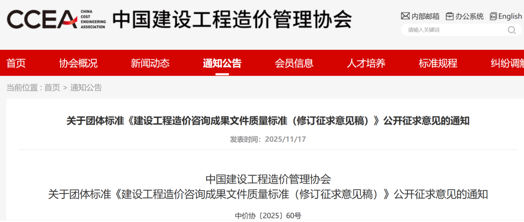 中国建设工程造价管理协会 关于团体标准《建设工程造价咨询成果文件质量标准(修订征求意见稿)》公开征求意见的通知