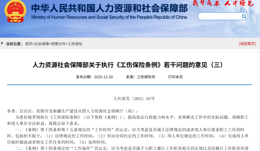 近日,人力资源社会保障部印发《关于执行<工伤保险条例>若干问题的意见(三)》(以下简称《意见(三)》),完善工伤保险法规的理解适用。原文链接:https://www.mohrss.gov.cn/SYrlzyhshbzb/shehuibaozhang/zcwj/gongshang/202511/t20251120_562398.html