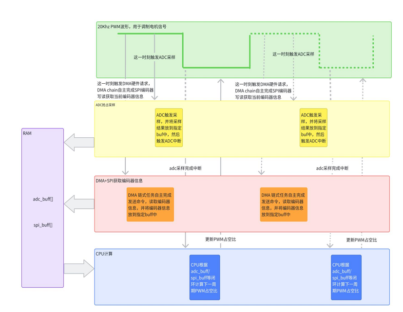 DMA链式传输通常能够降低数据传输的延时以及将规则的连续任务由DMA自主完成。此方案中ADC抢占采样、DMA获取SPI编码器信息并行执行,从而减少了数据从源到目标的传输时间。这对于实时系统和需要快速响应的应用非常关键。