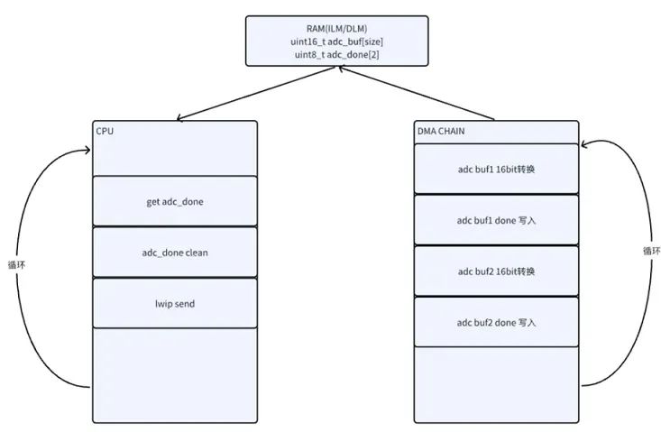 该方案通过PWM特定时刻触发ADC采样和触发HDMA转换ADC数据,并依靠HDMA链式模式,做成循环链表,考虑到中断响应占用CPU资源,在链式任务中增加状态标识,从而不启用中断,以此达到ADC采样及数据转换全自动完成,无需CPU参与,且将转换后的数据放到ILM/DLM,CPU零等待访问。最终达到性能最优。