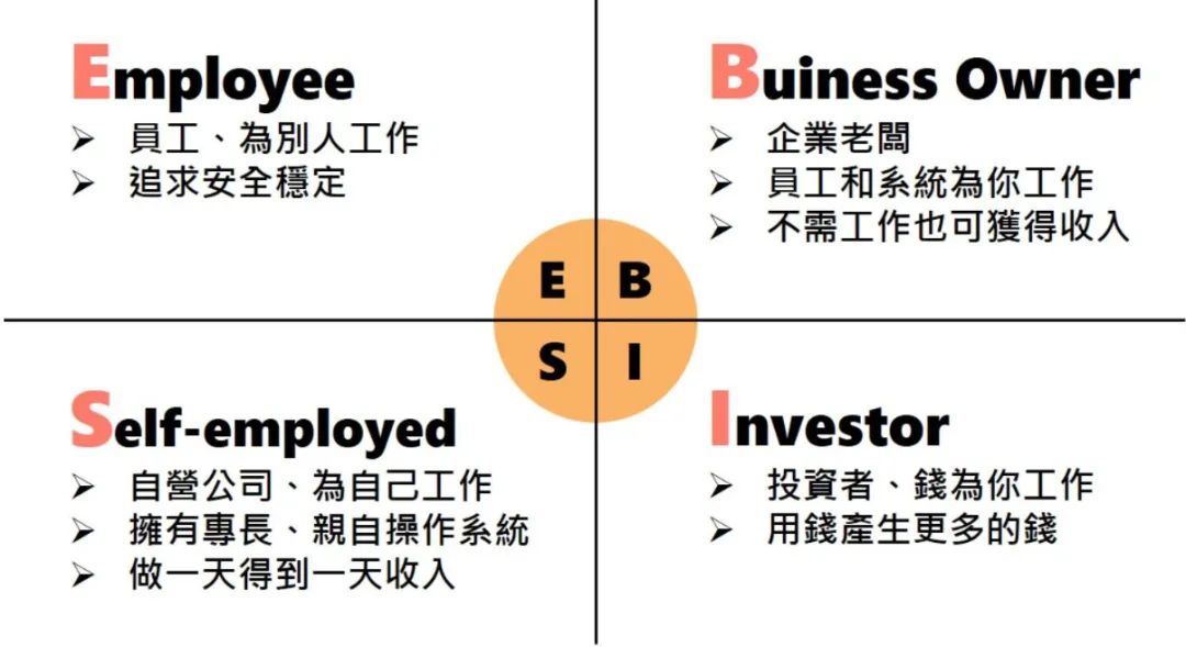 在现金流象限里,E(雇佣者)是最稳定的,S(自由职业者)虽然不如E稳定,但却是相对B(企业主)和I(投资人)象限里风险更少的。可以说,左侧的人生选项更具有确定性。