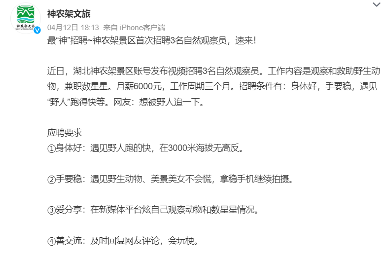 而神农架景区的一则招聘信息则写着:招聘3名动物观察员。工作内容为观察和救助景区内的动物,并兼职数星星,工作周期3个月,月薪6000元。应聘者除了分享自己每天的观察情况,还要具备随时“网上冲浪”的能力。